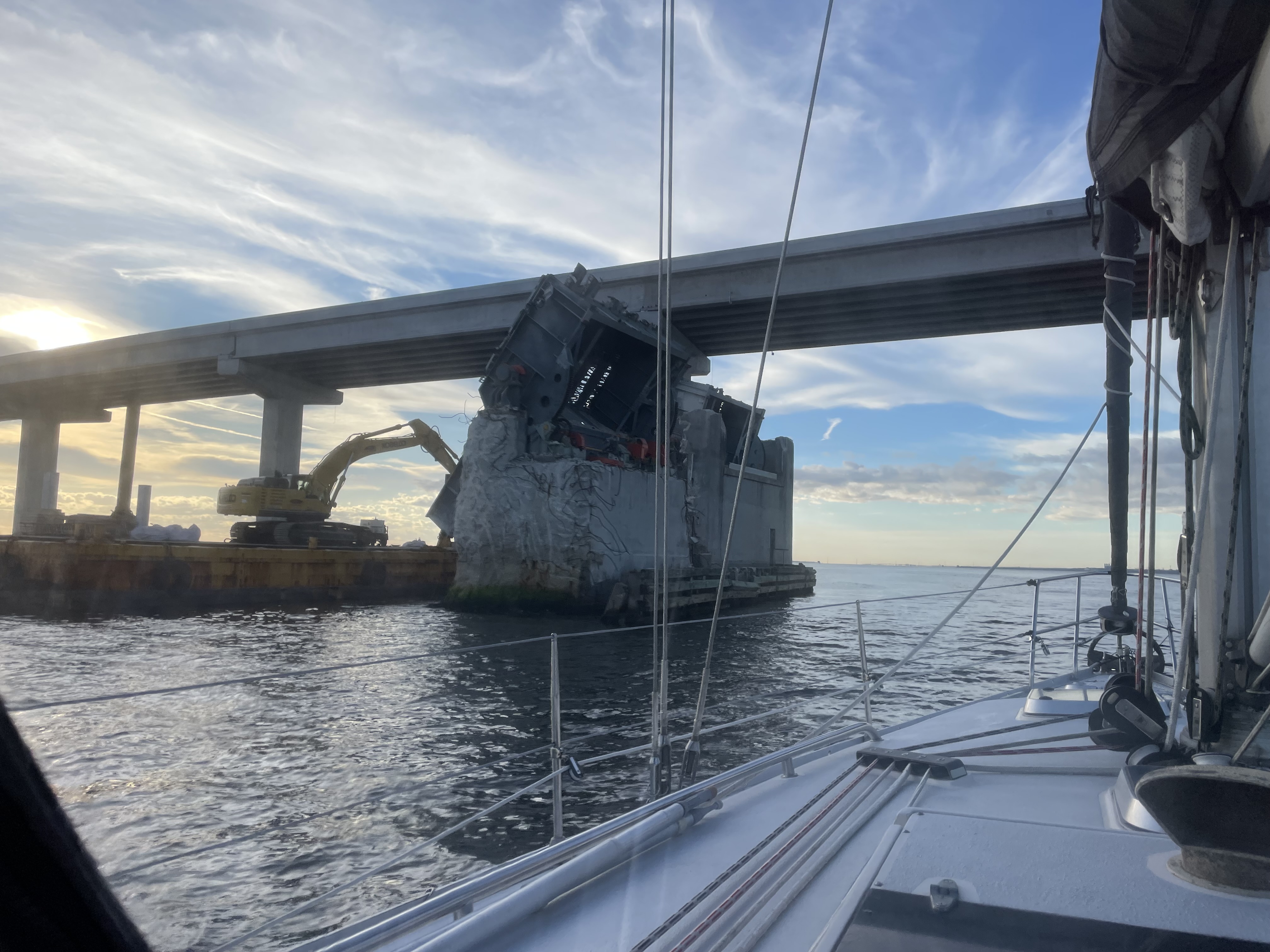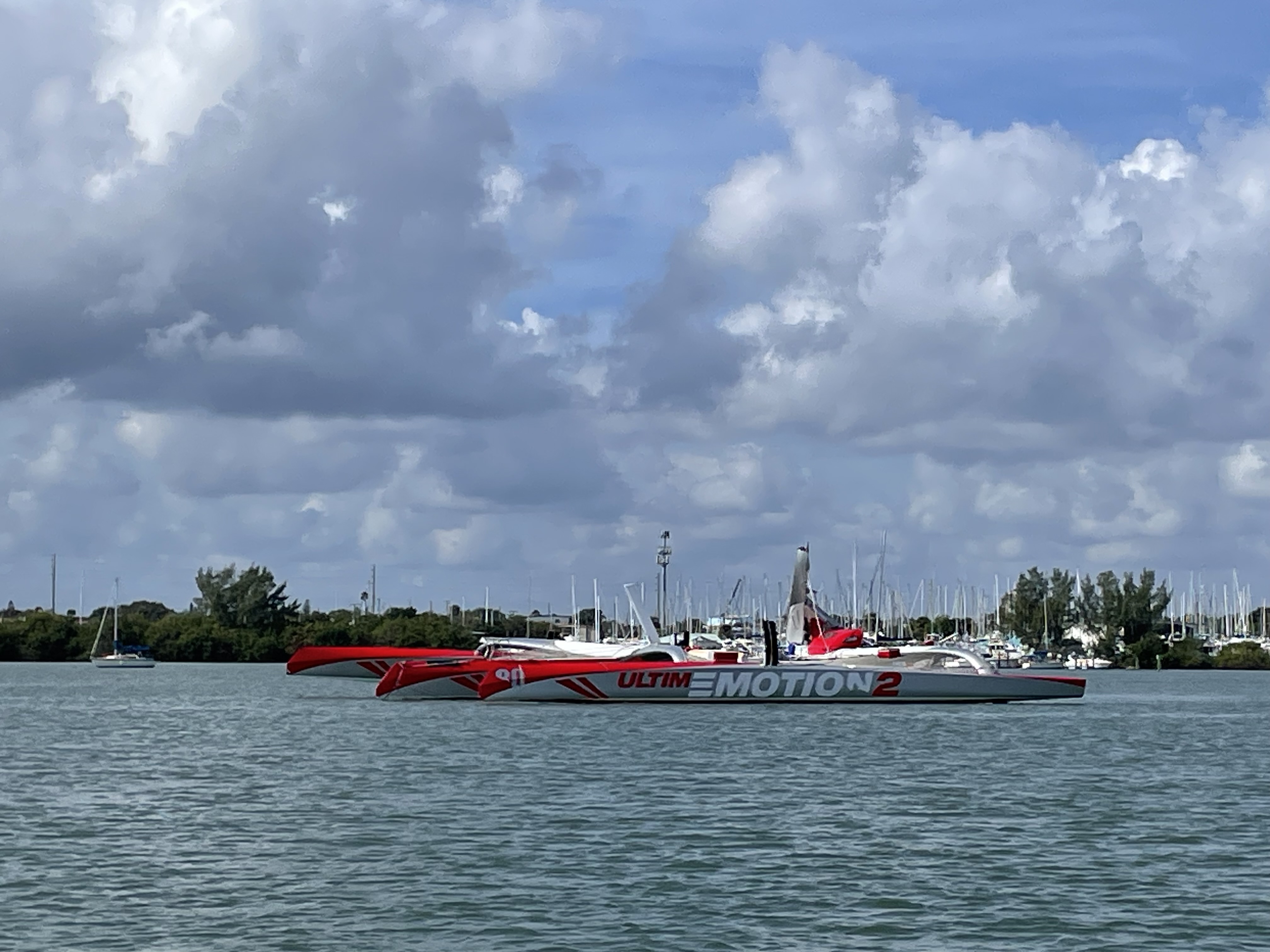 We had more one quiet anchorage in Hobe Sound by before Jupiter Beach and before we would hit the busy area of Lake Worth and West Palm Beach. The waters were calm and it would be a culture shock to enter West Palm the next day. On that last day we did come through Fort Pierce and saw a rather striking vessel. It turned out to be the Trimaran UltimEmotion 2 sitting at anchor just north of the North Fort Pierce Bascule Bridge. It had been damaged in the Newport to Bermuda race (August 2023) and limped back to Charleston in 37hours escorted by the US Coast Guard for 27 of those to make sure the crew was safe. It had been leading the race at the time when its 102′ mast had separated from the carbon fibre hull. The boat was still sitting in the Indian River Lagoon, in its damaged state awaiting repair. A very cool boat – but we didn’t feel so bad just puttering by slowly and taking it safe!