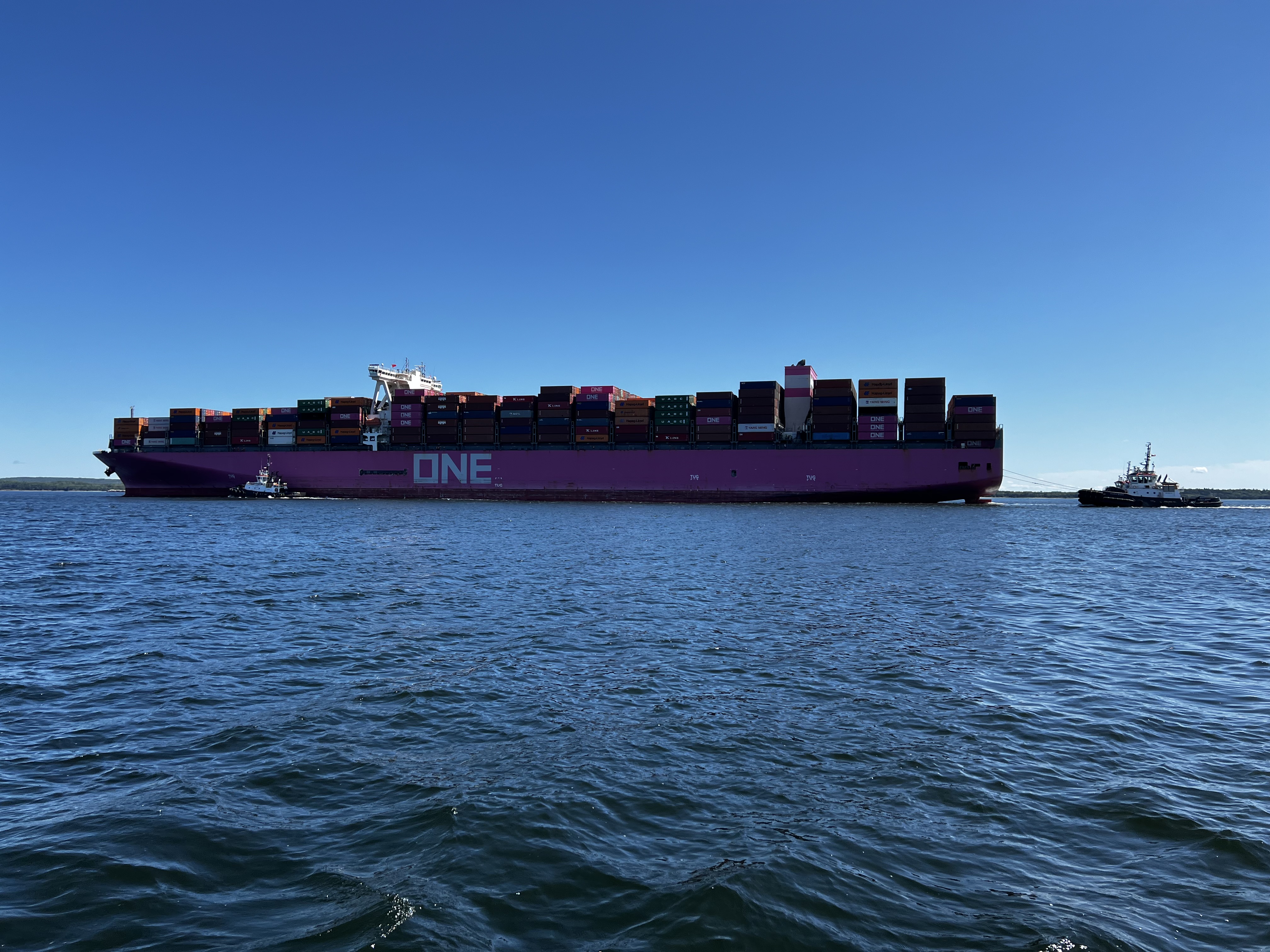 We had a beautiful easy morning in early August, with perfect wind and hoisted sails right away. Our son, Evan was joining us on this leg of the trip from Halifax to Lunenburg, where his girlfriend Kare was going to meet up with us and spend another weekend. We sailed out of Halifax Harbour with light winds along the south western shore following Mimi Jane, a beautifully newly built 51′ steel yawl, (a replica of the tuna fishing dundees found in northwestern France) designed and built by Murielle and Mark. We had seen this boat last year while in Brockville,ON at the Tall Ships Festival. Halifax Harbour control was hailing us both on VHF at one time to let us know a large ship, the Orion, was leaving harbour and would be crossing our path. It was loaded with wind turbine bases.