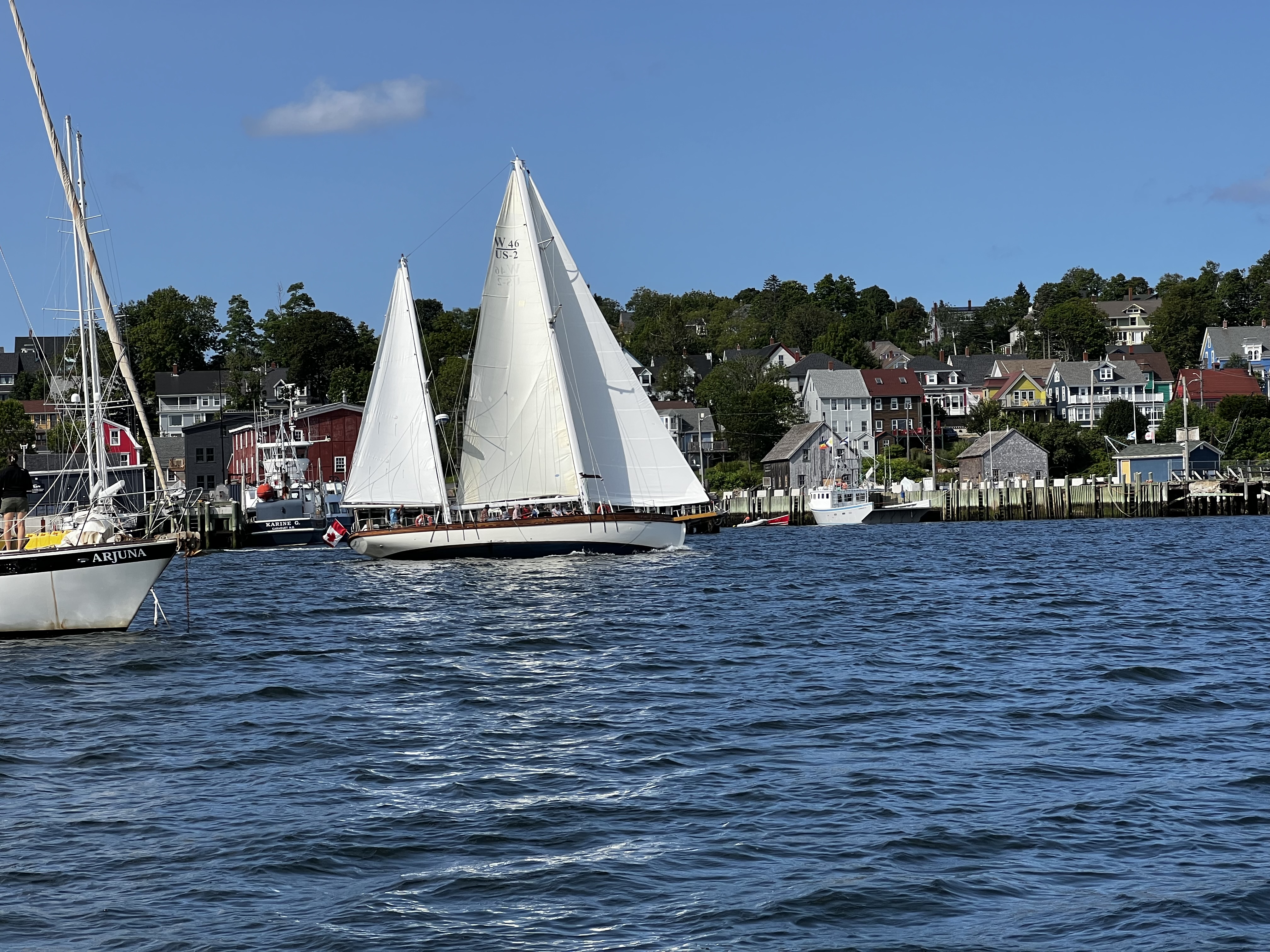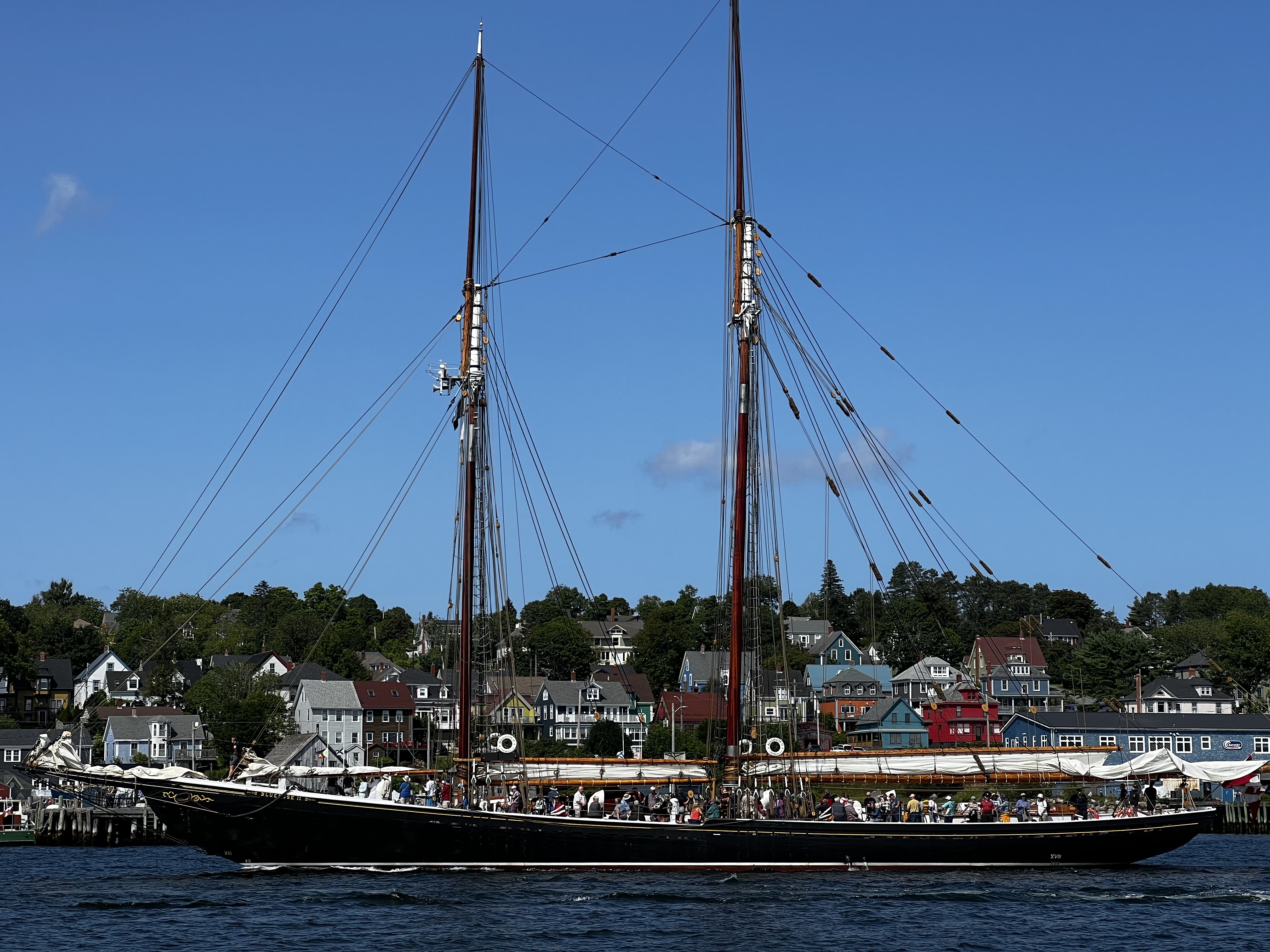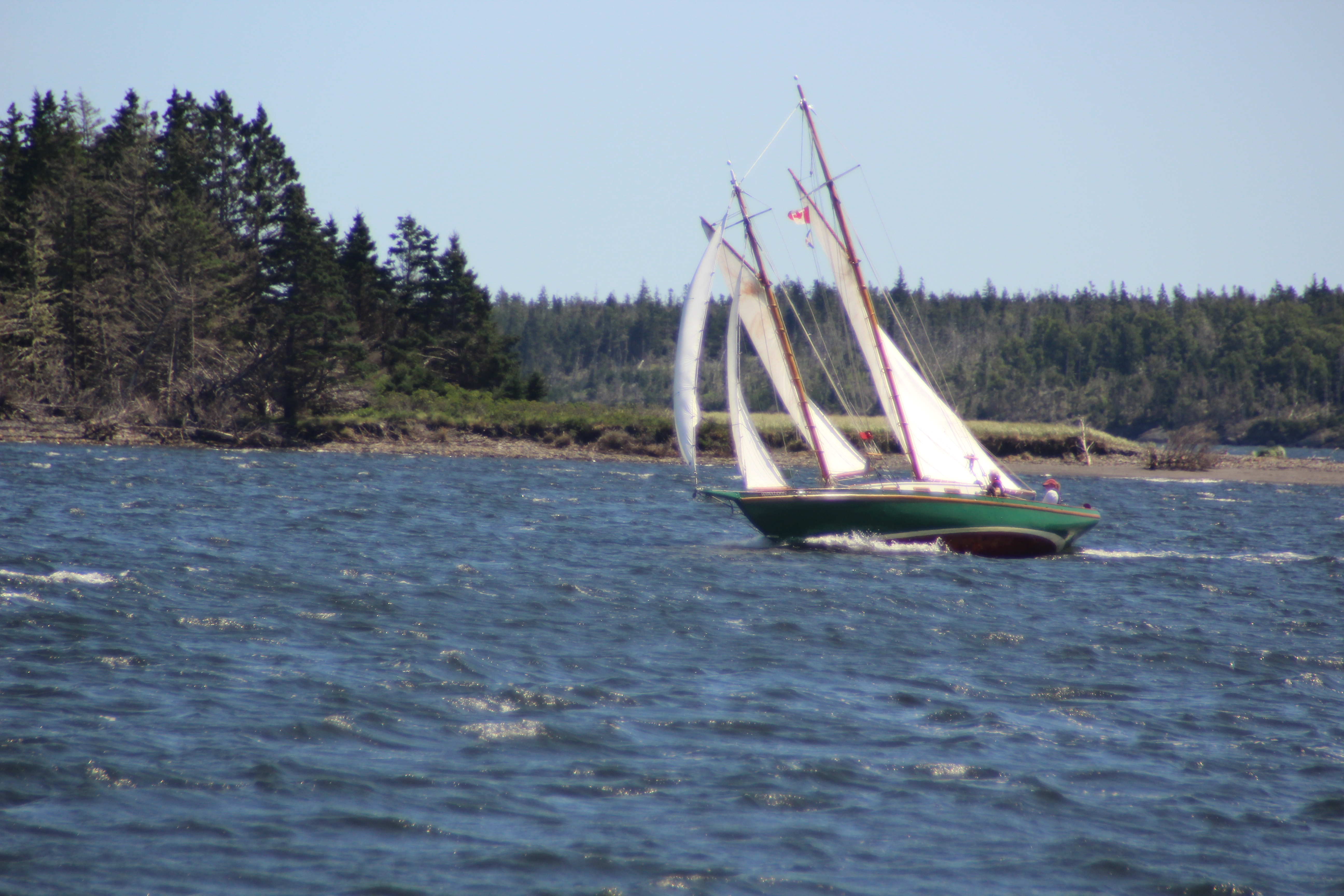 We stayed in this anchorage for another day as the rain and wind howled, and were delighted to see about 6-8 schooners of varying sizes tack up and down the bay under full sail. They were taking part in the annual schooner races that held each year in LaHave, and moored in the same bay.