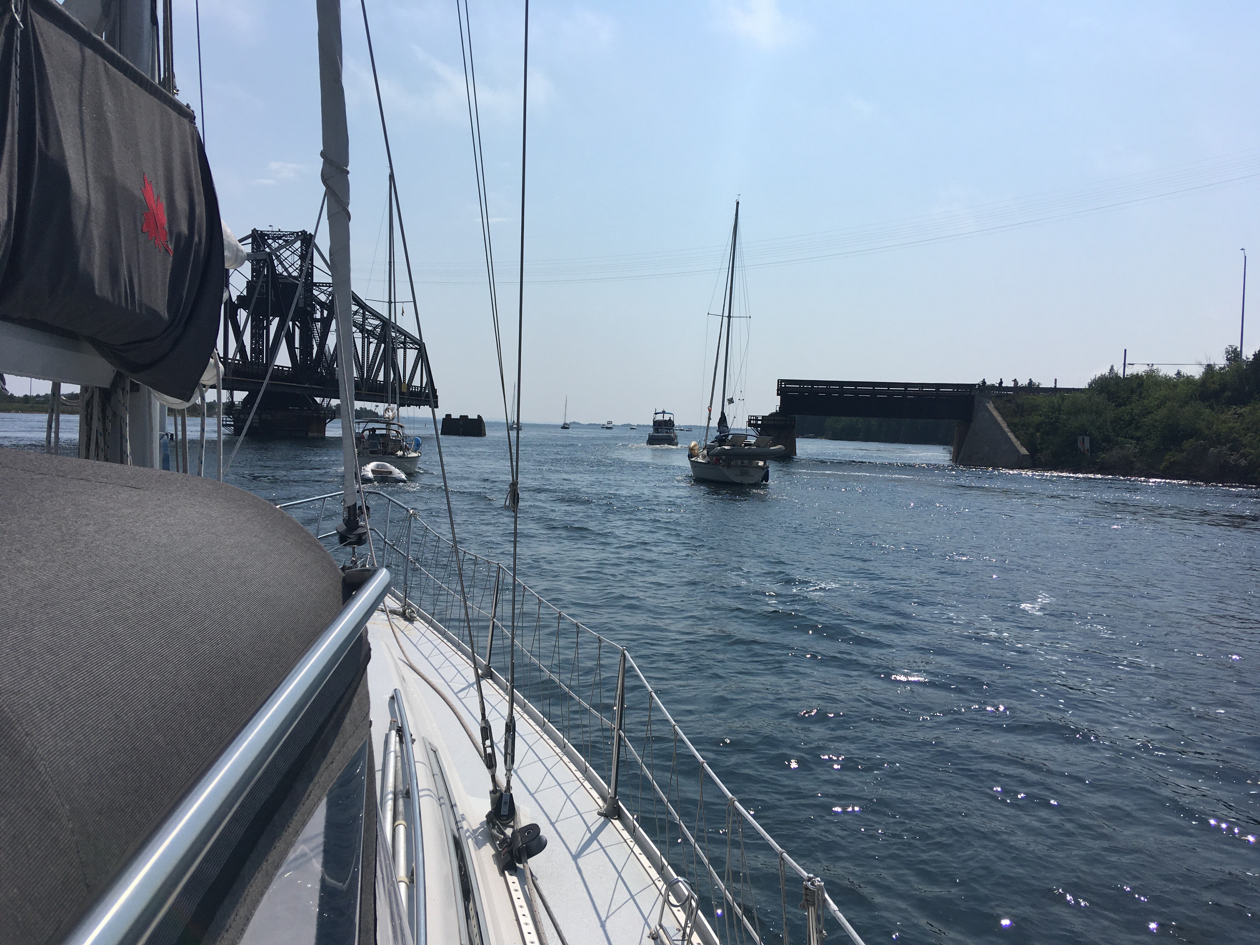 By 10:45 am we were already in Little Current, sailing all the way until we got into the harbour. A bit ahead of the bridge opening at 11am, we quickly decided to take an open end dock just East of Wally’s Fuel and filled our water tank. 10 minutes later we were back on the water and circling with 2 other sailboats in front of the bridge waiting for it to swing open. Behind us were at least 3 large motor boats hovering to get through east bound as well. As sailboats take a little longer to get through, plus they have a harder time hovering in one spot relying on one engine, motorboats will usually let them get through first. The bridge has an up bound and a down bound side so at least there is a bit of separation to the traffic flow as 11am is a popular time. The bridge started to swing a few minutes past 11 and once the green light showed we rushed through, this time with the current.