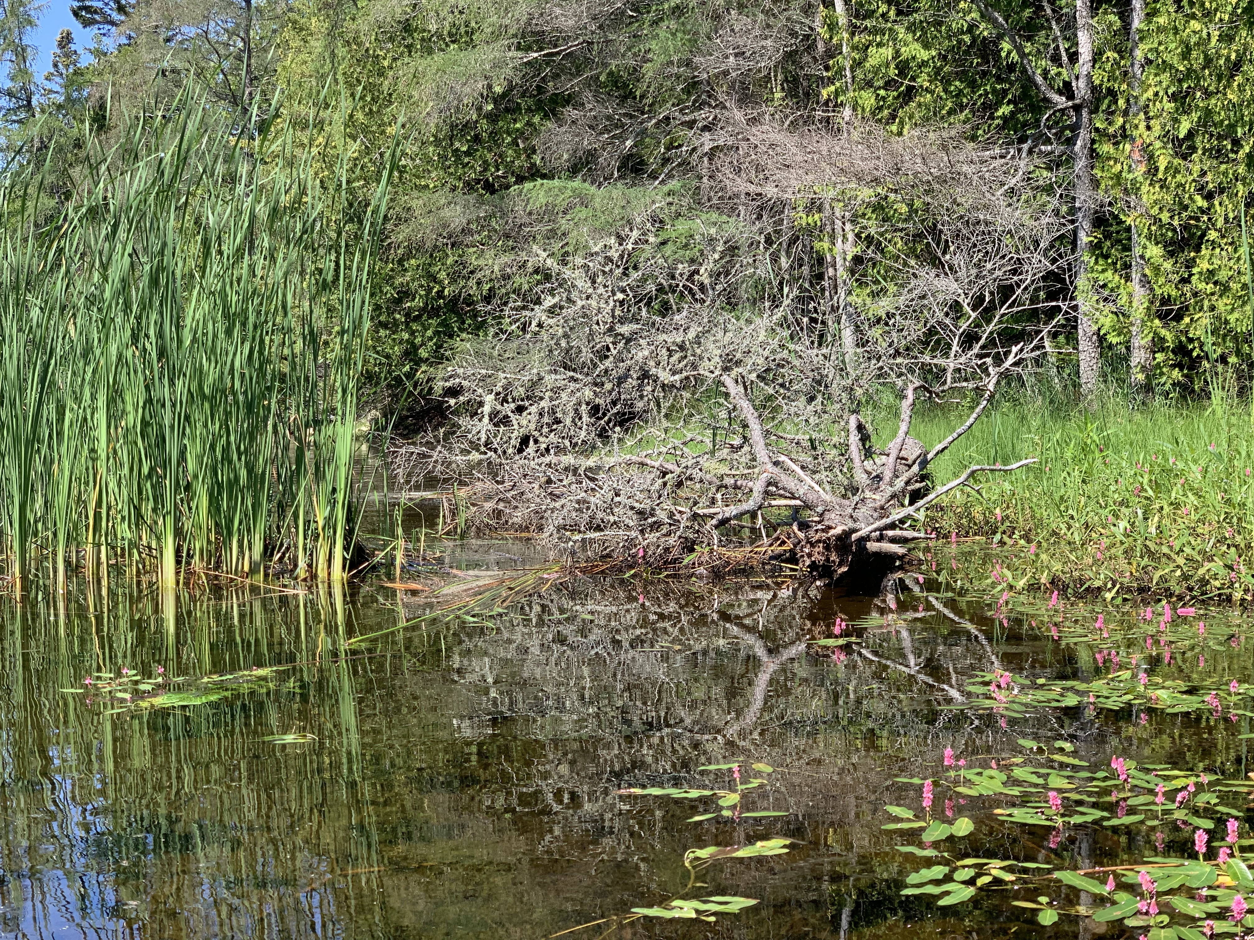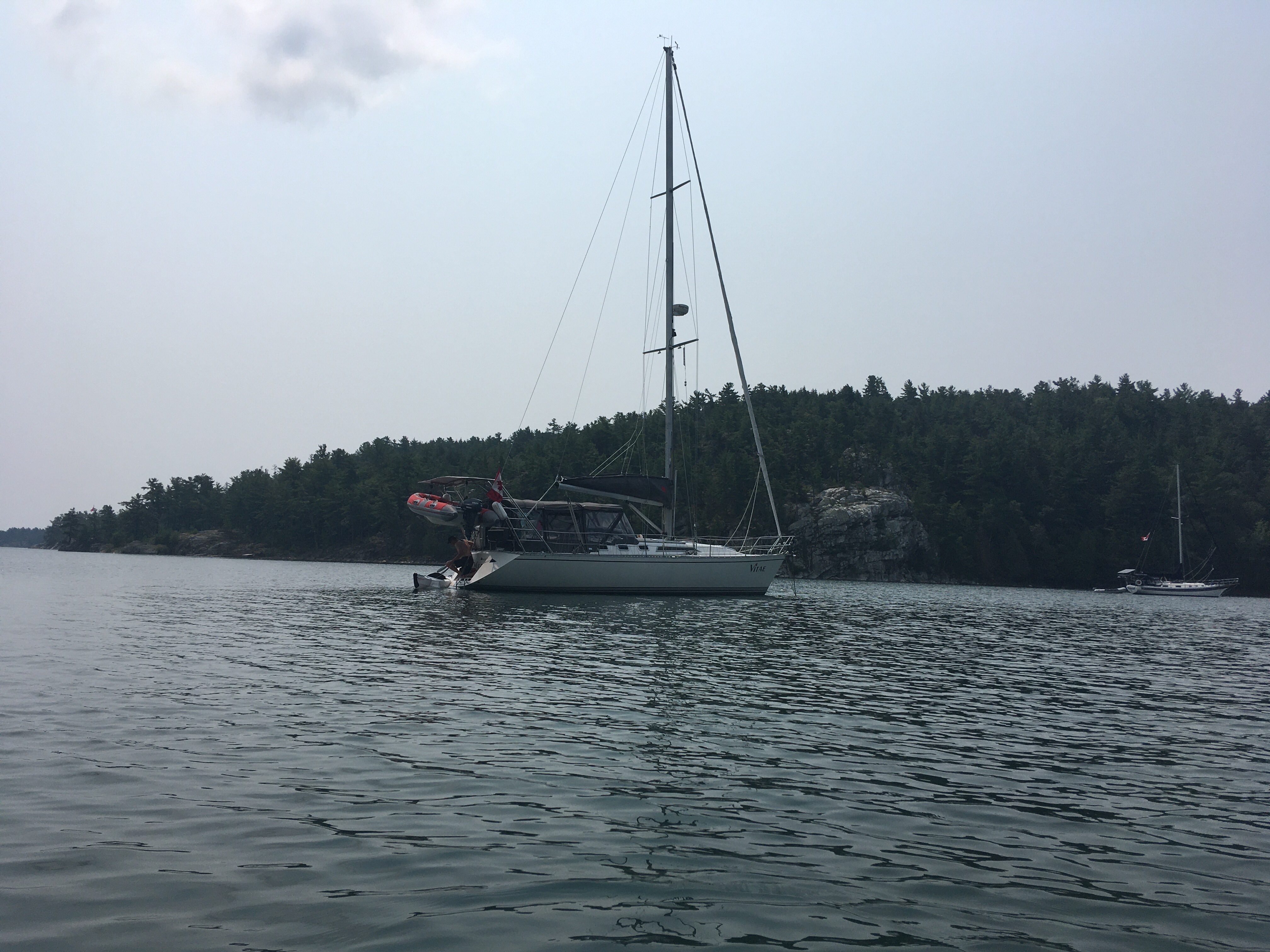 By 3:07 pm we were in the outer bay of Covered Portage. We tucked in close to the north shore but still with enough space to swing. The neighbouring boat had mentioned that boats swing a bit arbitrarily here, so we had reanchored a bit further away from them. As none of the other sailboats here were tied to shore we decided to follow their lead. Our neighbours were Ralph and Sue from “Ceiba I”, a 30 something Catalina out of Brights Grove near Sarnia. We invited them over for a sundowner and they were thrilled to get a tour of our boat as they had owned a CS previously. We had a fun chat sharing sailing stories and talking sailboats. Once again we realized – we need to make boat cards. It’s so easy to share your boat contact that way and you do remember names much easier from season to season. Another Winter project.