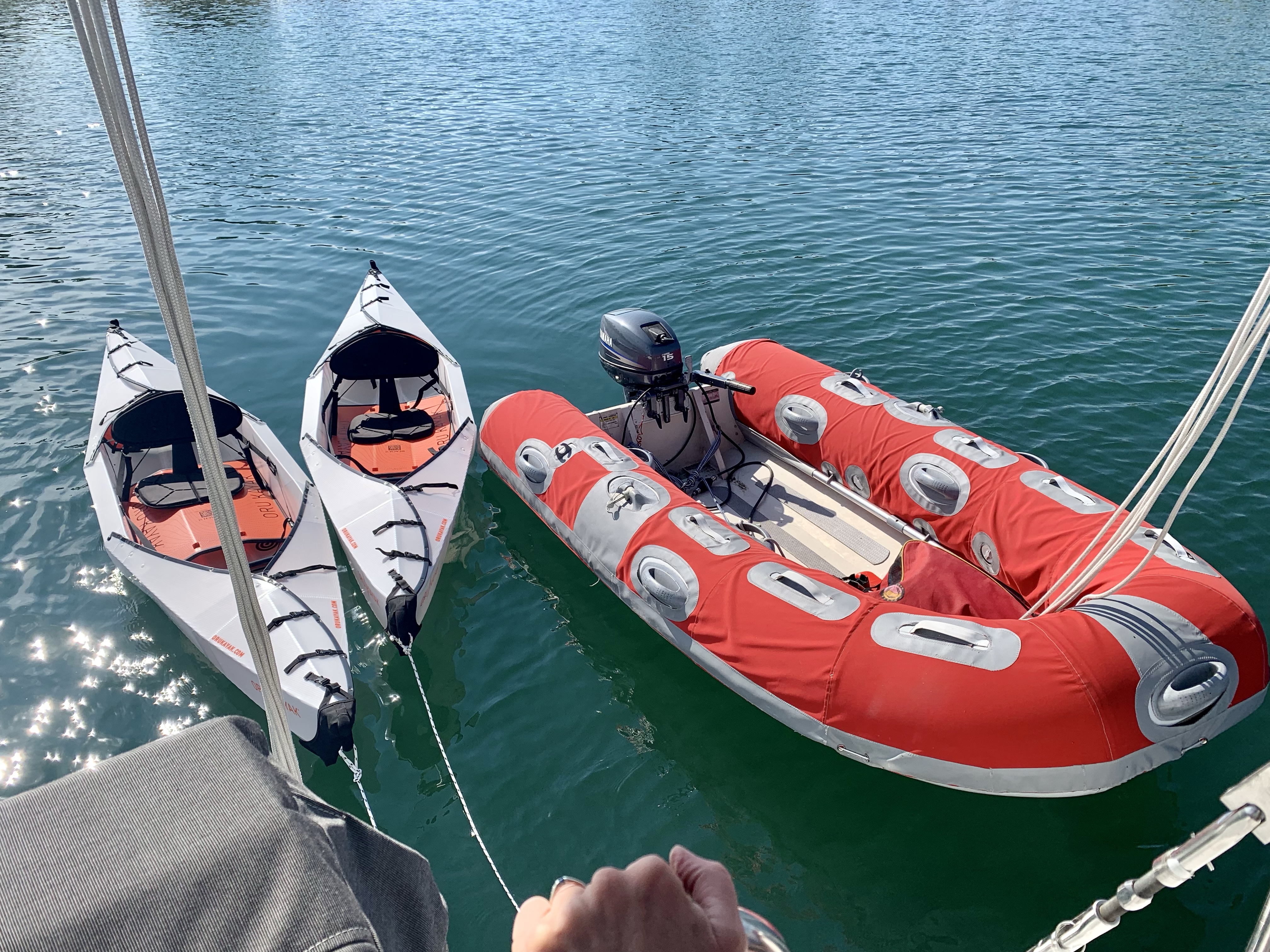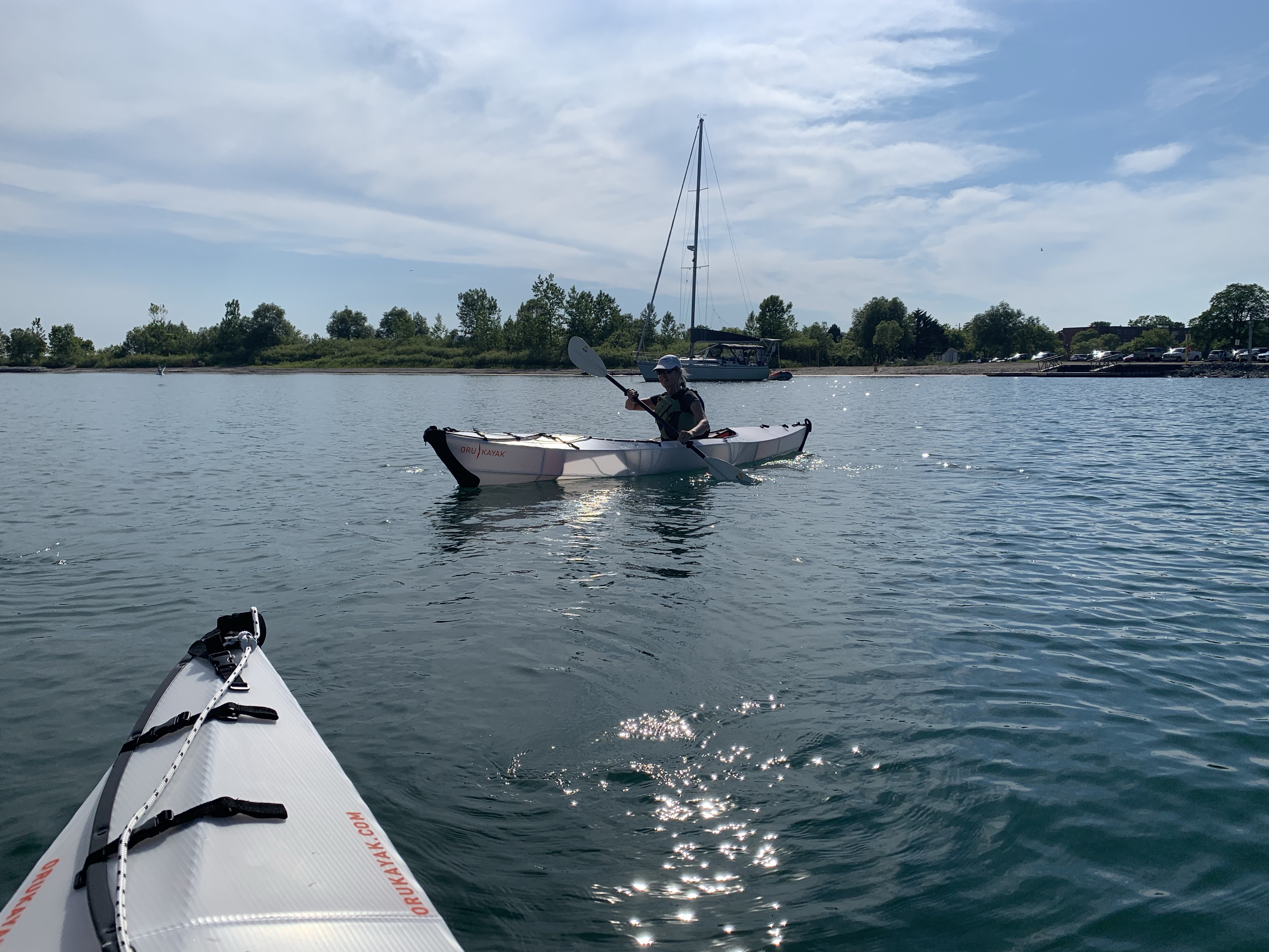 Once anchored we got to try our new foldable kayaks, the Oru kayaks. It probably was a bit of a show us doing origami on the deck of our boat. These kayaks are good for tens of thousands of folds and are apparently very puncture and abrasion resistant. They are super light, even I can easily lift the 12’ kayak over the lifelines. They fold up small enough to fit through the companion way and don’t take up much space in the quarter berth. They are very nimble on the water and stable enough to get in and out from the swim platform. We were quite impressed and happy with our first paddle. The real test will be once we get to the North Channel, as we love quietly gliding through smaller waterways instead of taking a noisy and cumbersome dinghy. Over the last winter we had decided against getting bikes to store on the boat and had started looking for a couple of kayaks that would work. Our friends at our favourite outfitter store “Wildrock” in Peterborough suggested the Oru as the best choice today and we took their advice. Thanks Jon and Scott !