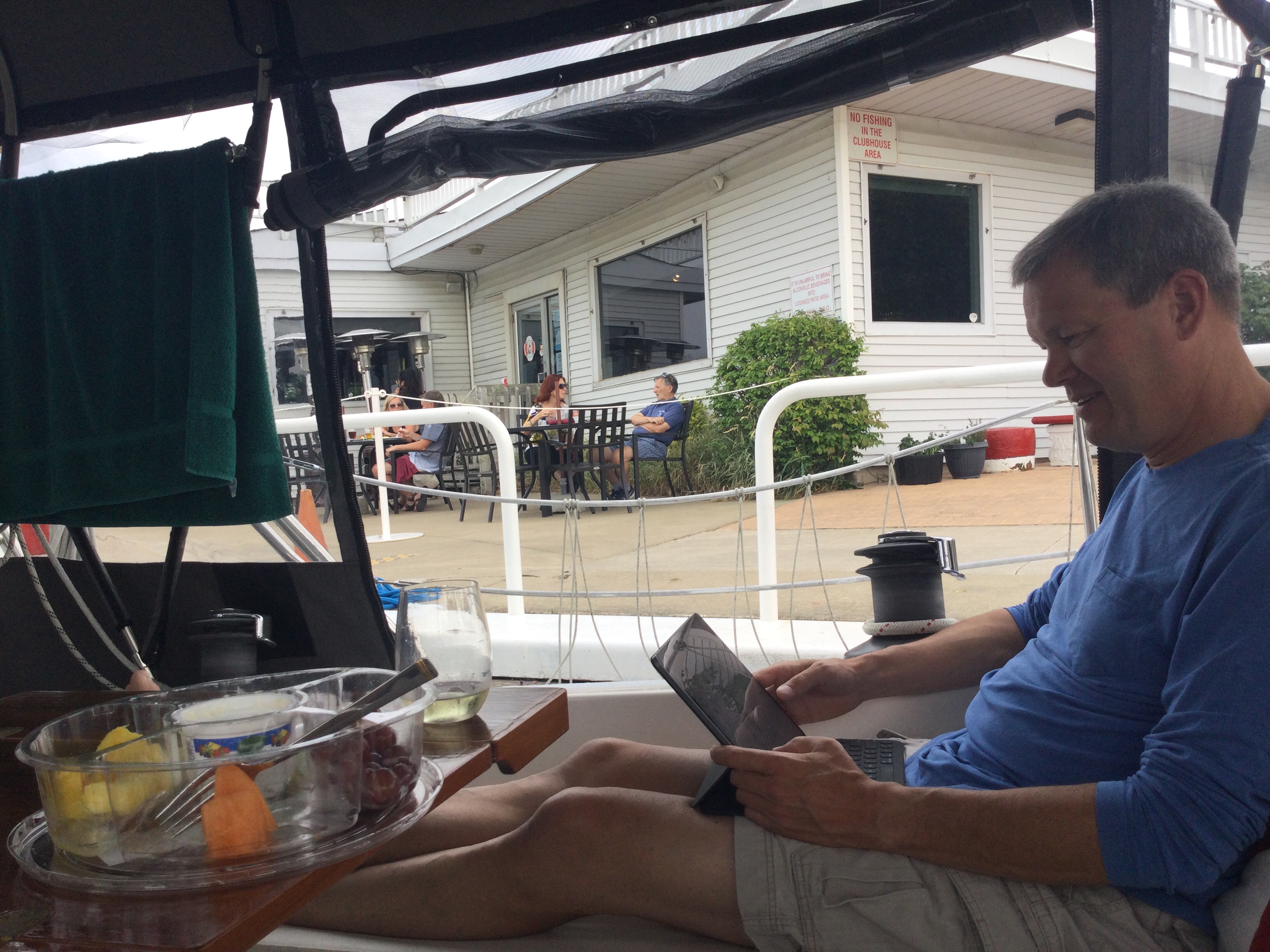 We dinghied over to the Multi Hull Club and visited with friends Shane and Andrea, whose catamaran “Carpe Diem” was docked here. The club also offers 2 nights reciprocal but it might be on a mooring ball. There’s no water on the docks here, but they have a nice club house with fire pit and showers. Its a very friendly, down to earth club and they welcome all types of boaters. Andrea and Shane love cruising the Great Lakes and also plan to take “Carpe Diem” south, hopefully next year. Just recently they have started their own distribution company for sailing equipment. Check out Indie Marine for some well tested marine products.