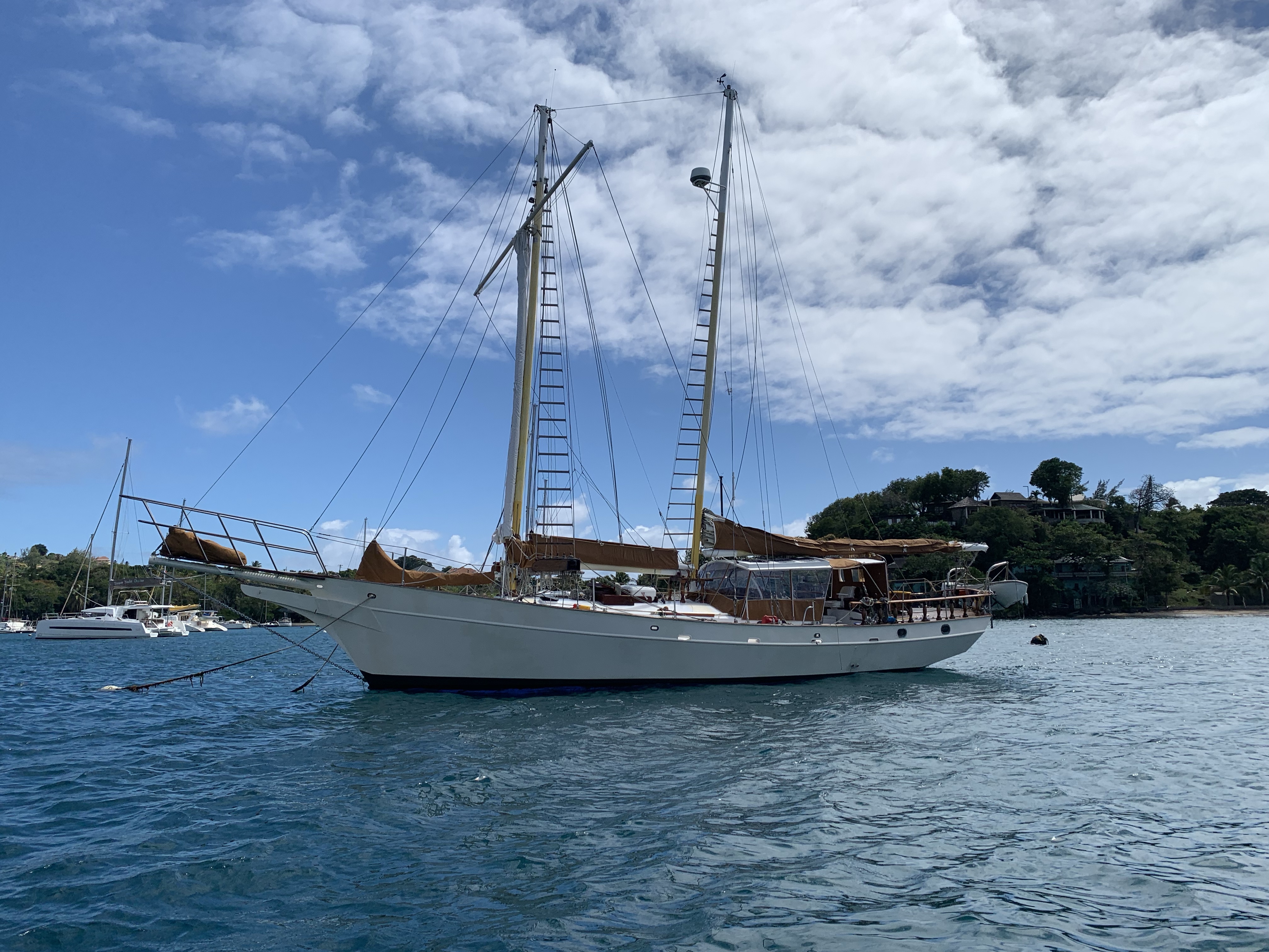 It was a quick sail over to Bequai, which is just about 10 NM south. We got our first introduction to sailing a catamaran. Since this cat was set up for cruising charters it was almost too easy to sail. Willow Dew (what a great omen – our granddaughter’s name is Willow!) was built in 2014. Equipped with 2 engines, a generator, solar, freezer, fridge, electric winch at the helm for raising the main, electric windlass and a self-tacking jib, this boat had all the comforts. Not a high performance sailer, but safe and quite easy to sail.