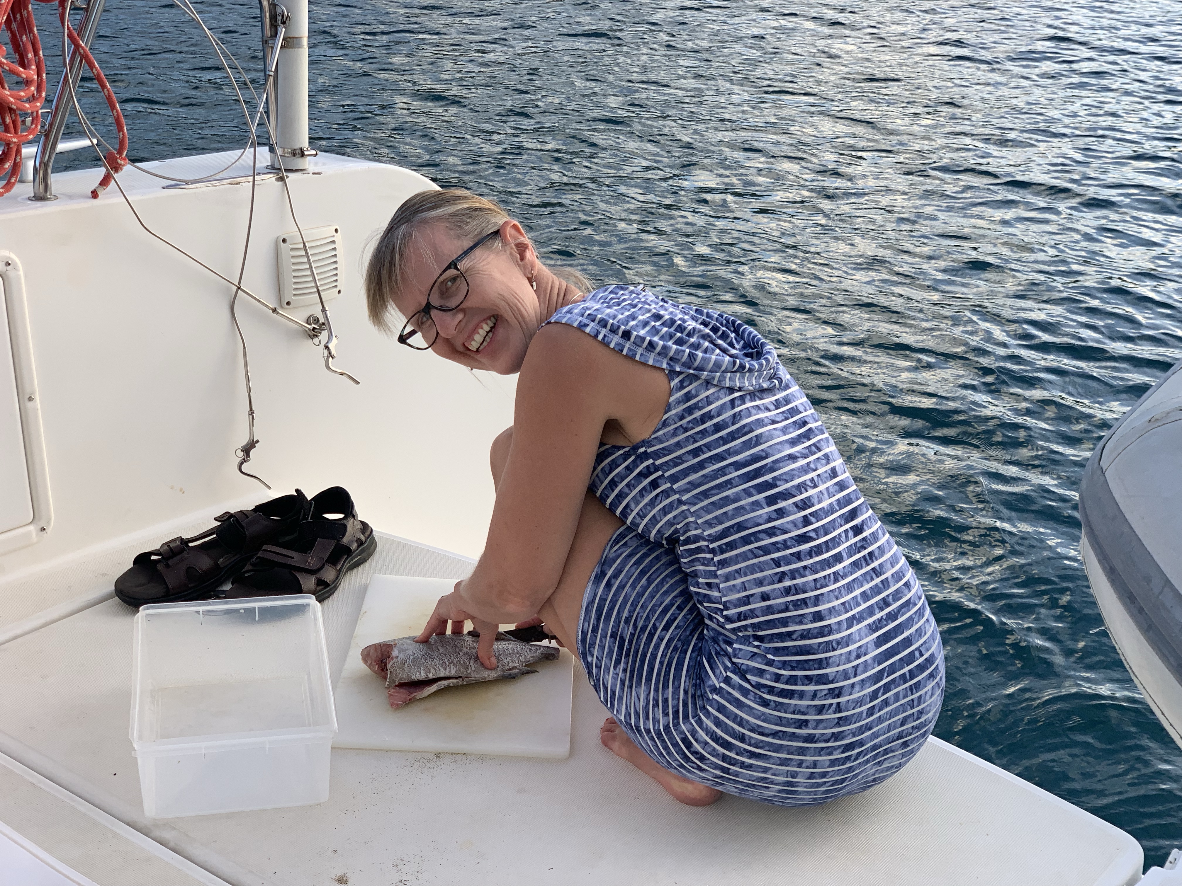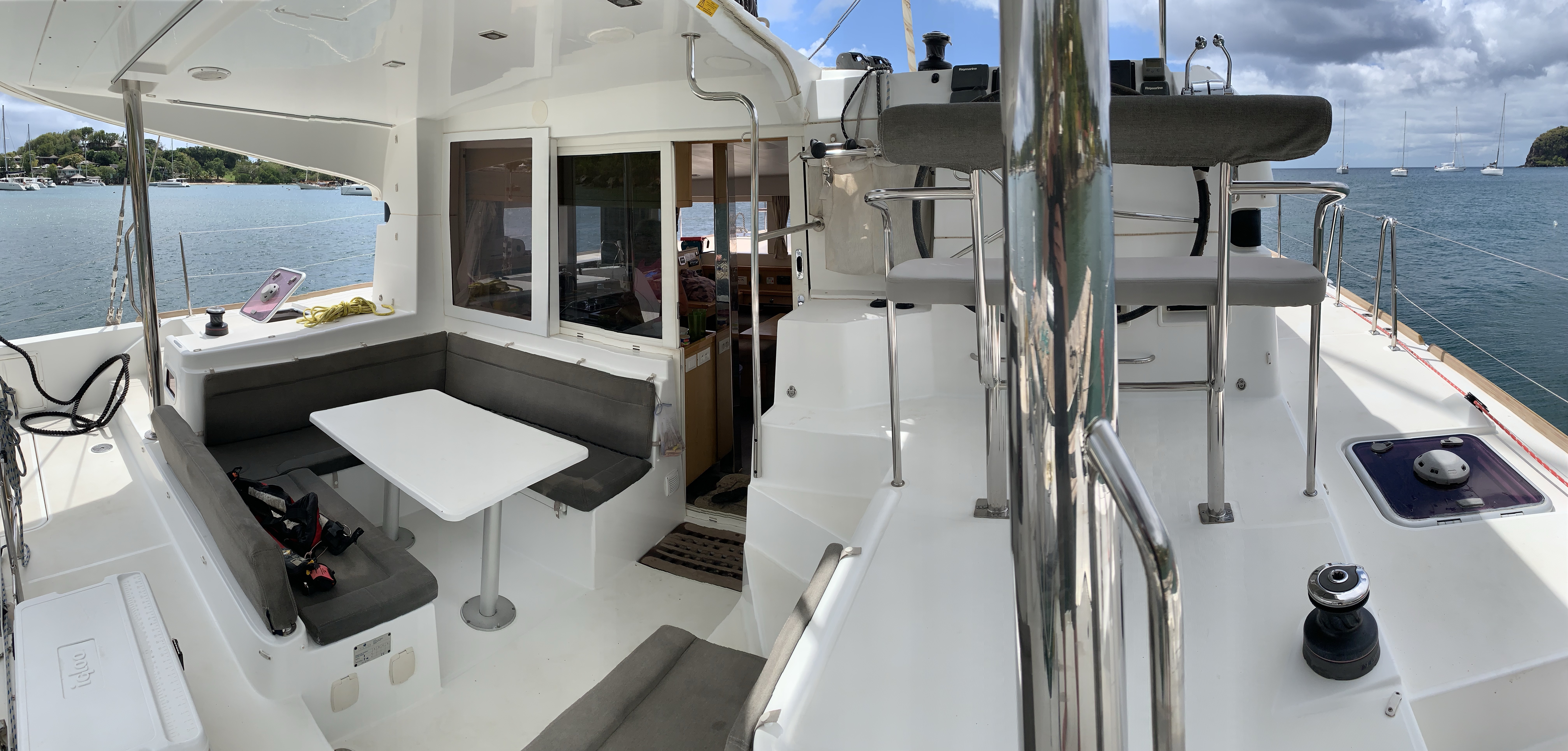 We provisioned the boat and moved on board. So much space!!! We are used to mono hulls. But a catamaran has of course 2 hulls. So we have 2 cabins and our own head with shower in one hull and Monica and Rob have the same in the other. The boat also does not heel. We can leave cups and plates out on counters. So odd – no running around stowing things before you are ready to set sails. There’s a huge back cockpit area and stairs going into the water for swimming.
