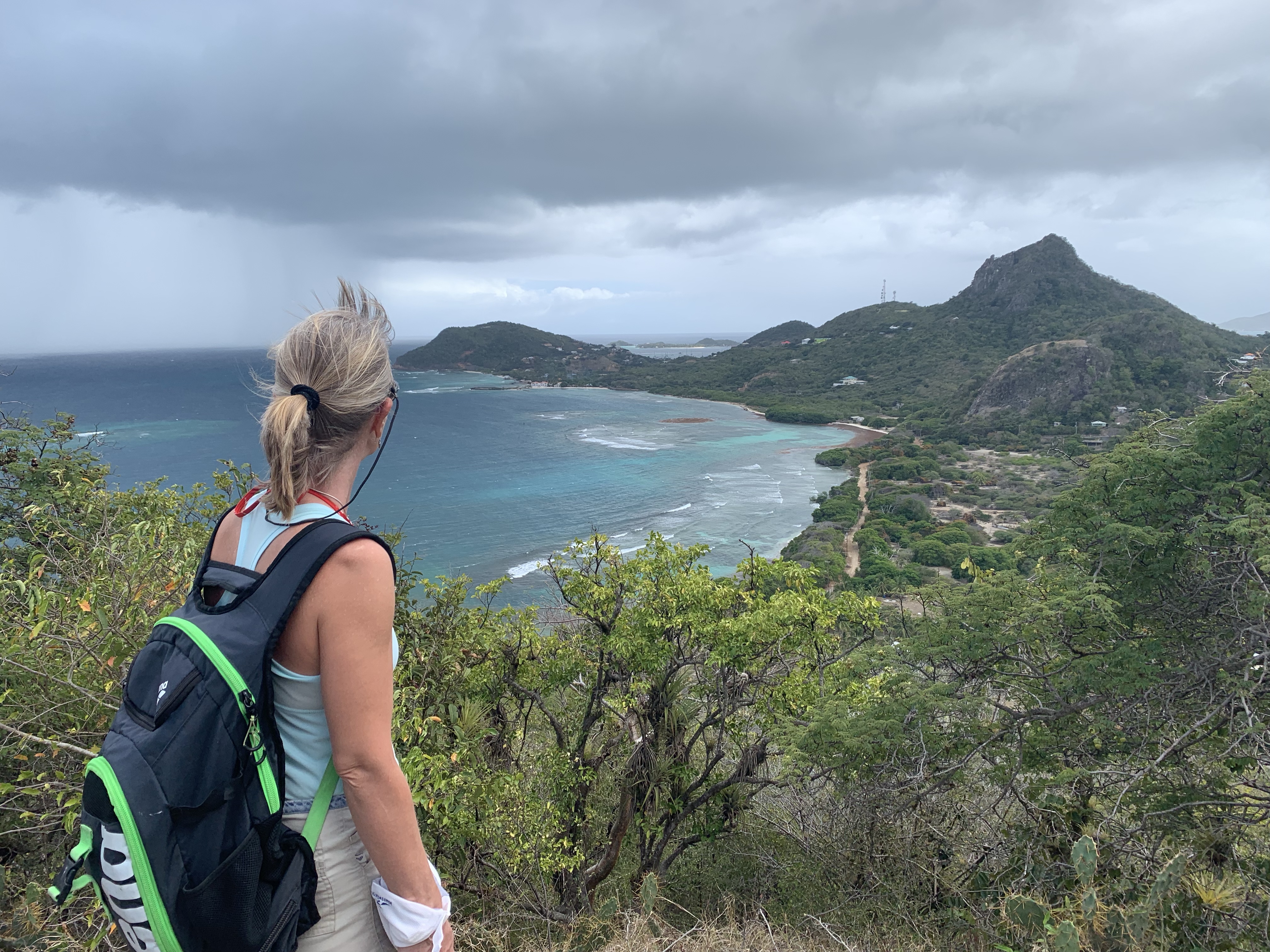 One of the highlights was a hike around Union Island, at the southern edge of the SVG archipelago. On a clear day you can see the outline of Grenada from here. A rough ATV road leads up from the beach and connects to the proper island road. With running shoes it was no issue walking up the steep hill and once at the main road the walking was rather civilized, more a walk than a hike. The day was a bit overcast and at the top of the island we got hit with a nice rain shower to cool us off. The views were spectacular with the odd rain cloud chasing across the horizon.