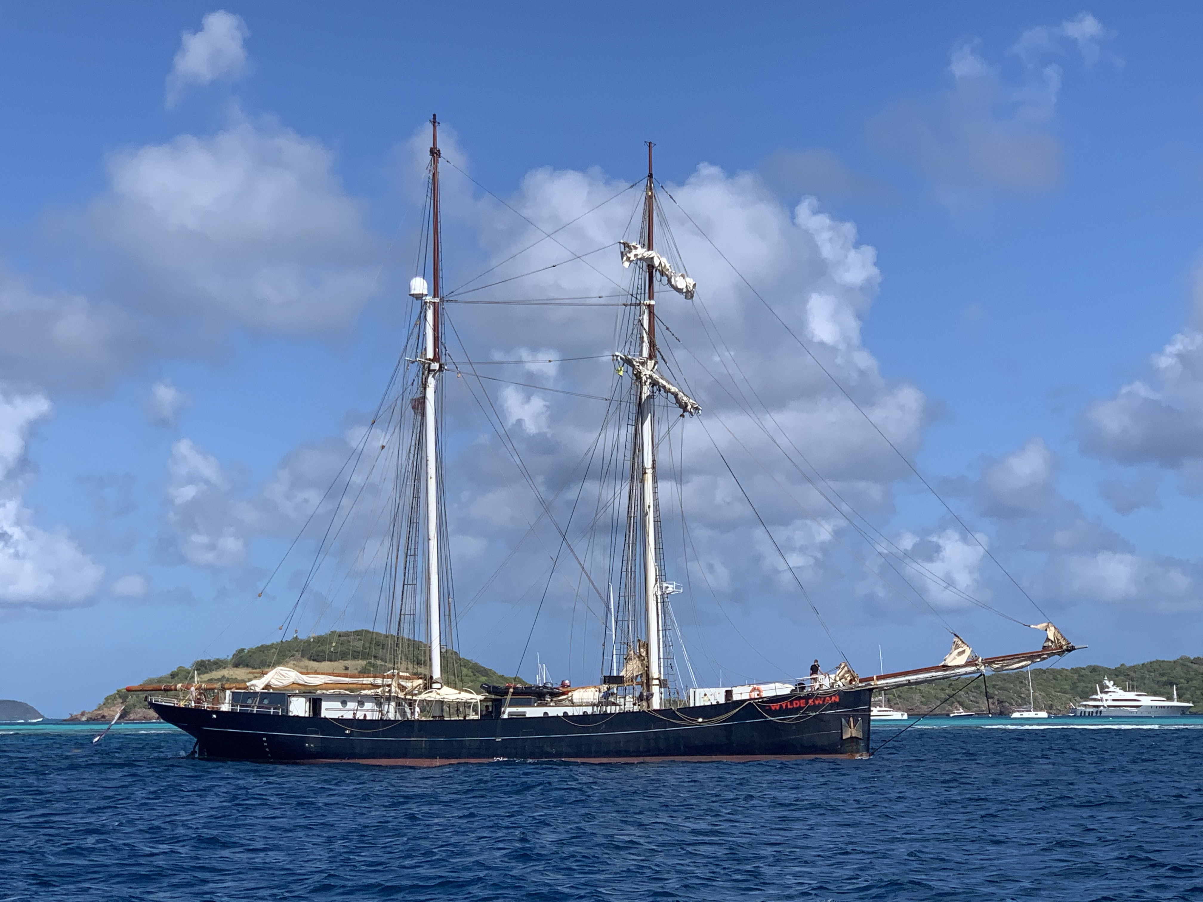 While we were having our snacks a striking looking schooner we had noticed the day before seemed to like our idea and followed our example. It was “Wylde Swan” – the worlds largest and fastest topsail schooner. She can sail up to 18kts and was built in Germany as a steamship for the herring fleet. How cool to get a closer look at it. She was on a trip from Anguilla down to Tobago and back, when our path crossed.