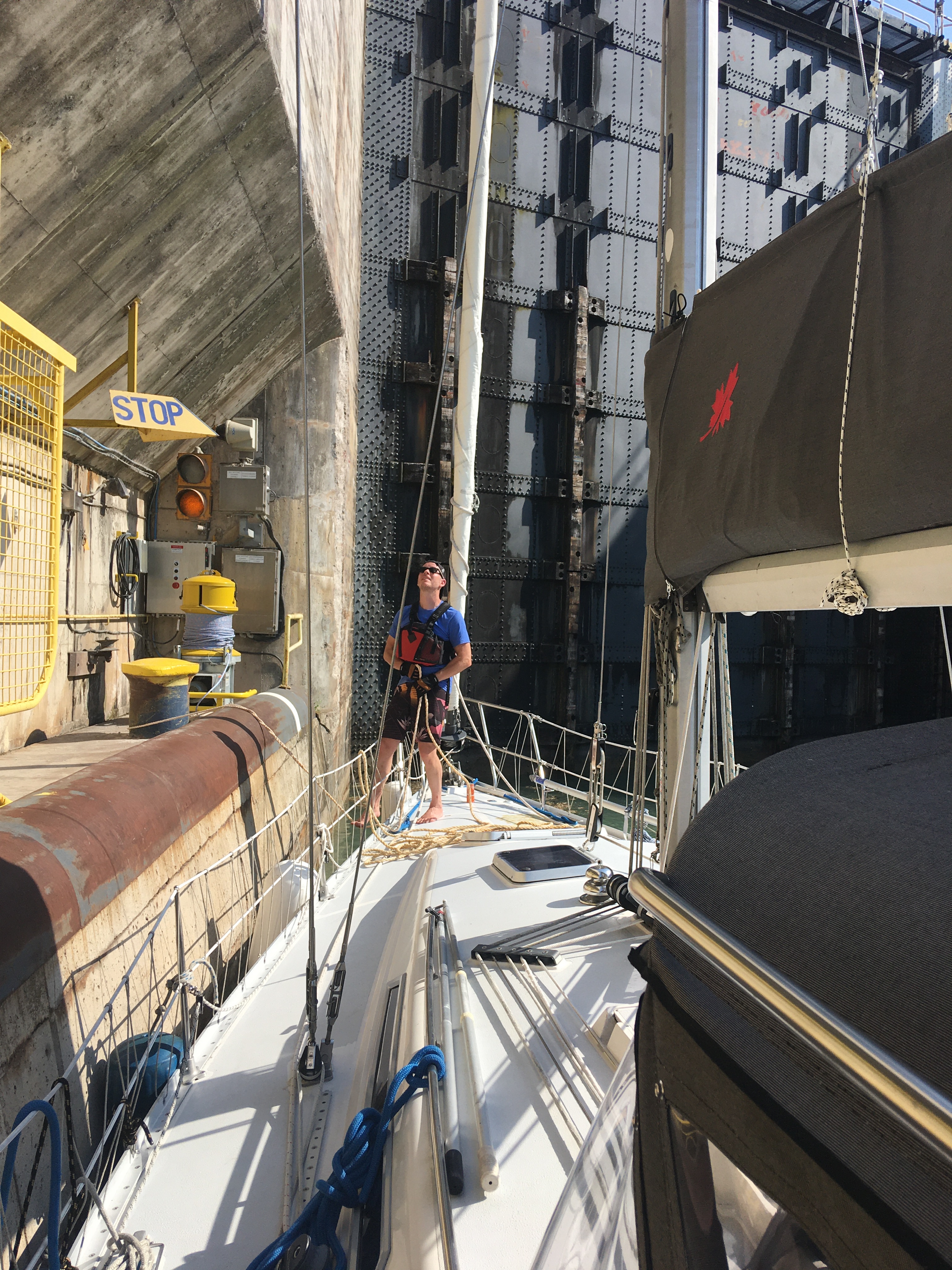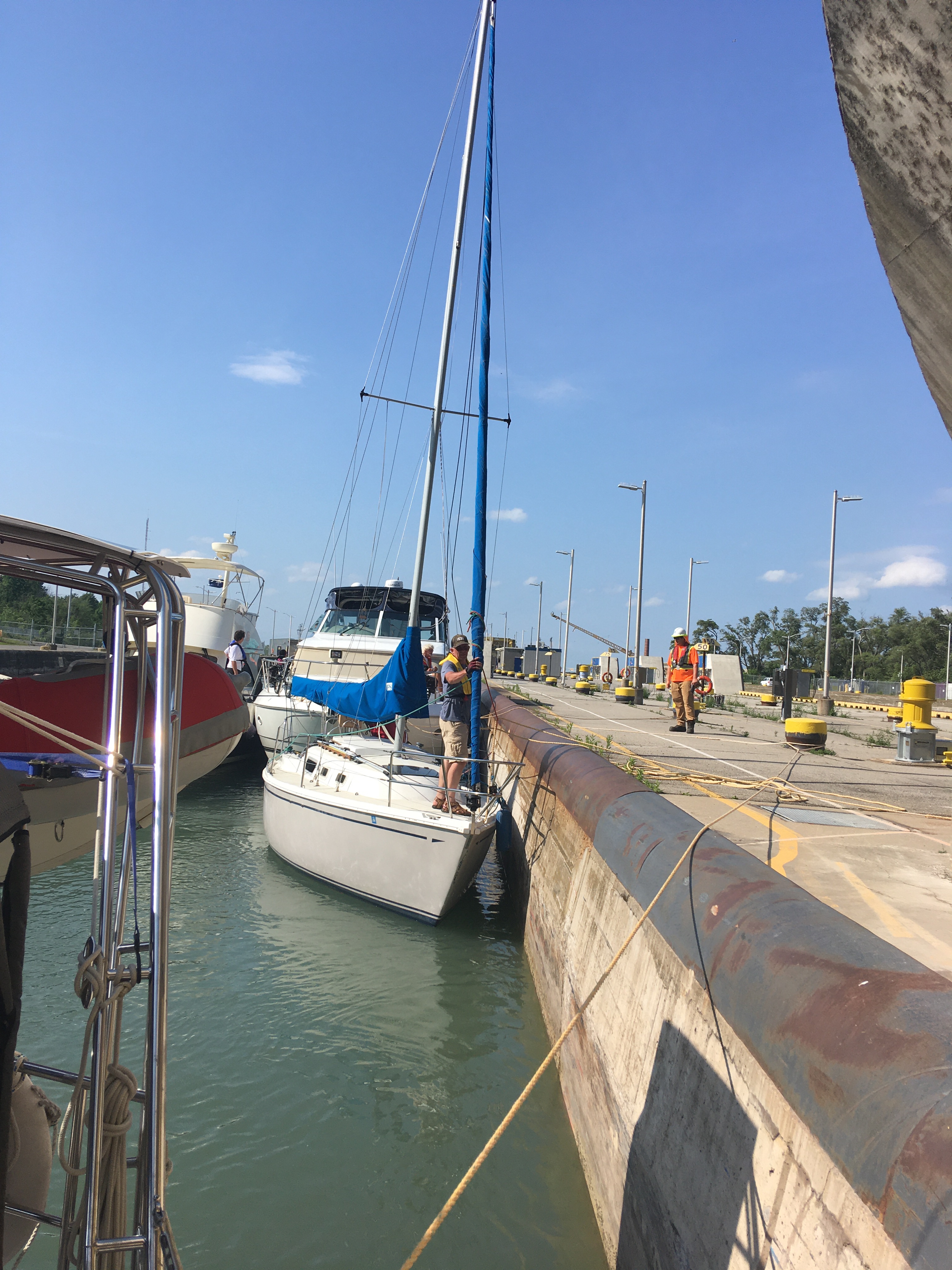 Our Day on the Welland was, as is often the case, a long one. There were 4 recreational craft to go up that day. When we arrived 2 larger power boats were already waiting on the dock, and we slid in behind them and checked in with the Welland control. Shortly thereafter a small 27 foot CAL sailboat arrived and had significant issues docking. After all the drama unfolded, they explained that two of them did not have any experience and the Captain had only purchased the boat a week ago. Needless to say we were beginning to have concerns about how the day would unfold. Then, shortly thereafter one of the Power Boat Captains came back and explained that he was a very experienced professional who had done the canal multiple times and that the Welland controllers had left it to him to organize the 4 pleasure craft. He said there were only going to be 3 sets of lines, and that the two sailboats would have to raft up in the locks. We explained that with the predicted 30 knot wind gusts and turbulence we had concerns with the two sailboats tangling masts and we would prefer if the two motor boats rafted, or if one of the sailboats rafted with a power boat. He then changed his story immediately and said it was up to the controllers to decide and he was just following their direction. We were concerned enough that I decided to call the control office. I described the situation to the first controller, he transferred me to the local controller in lock 1, and finally he transferred me to the head controller of the canal. When I explained exactly how the last hour had gone, and what my concerns were, he asked me if I would be happy if I rafted with a power boat, or the two power boats rafted. I said either of those options were fine by us, and he said to leave it with him …